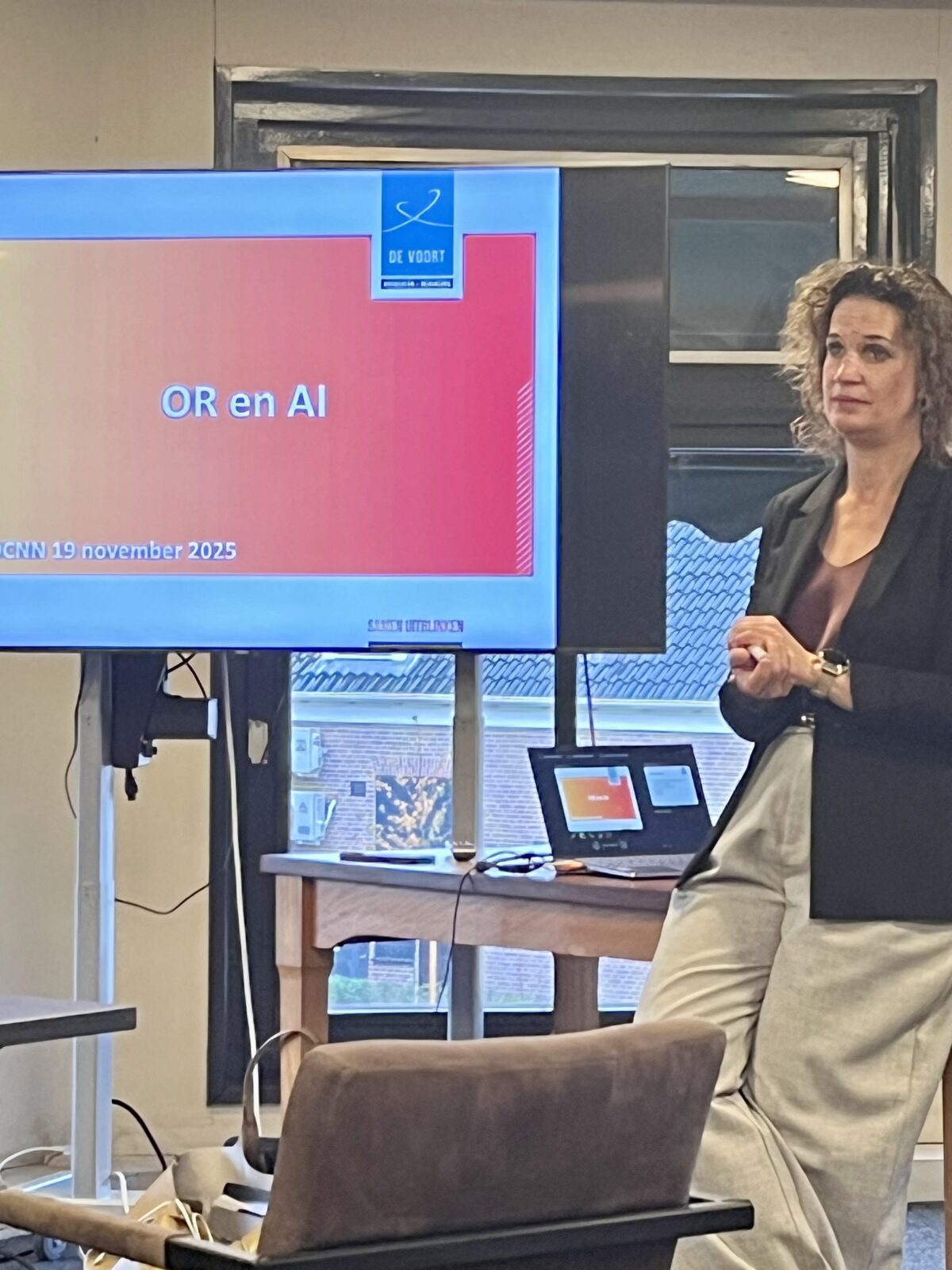Advocate Els Huisman gaf een heldere introductie over AI in de praktijk van sociaal ontwikkelbedrijven. Veel organisaties staan nog aan het begin van doelgericht AI-gebruik, bijvoorbeeld bij planning, administratie of verslaglegging. Wat betekent dit voor de OR? De WOR biedt adviesrecht bij belangrijke technologische voorzieningen, maar in de praktijk krijgt de OR hier nog weinig adviesaanvragen over. Belangrijk is daarom dat OR’en met bestuurders afspraken maken over verantwoord gebruik, transparantie en privacy. Ook kan de OR AI zelf inzetten, bijvoorbeeld bij het analyseren van documenten of het voorbereiden van overleggen.